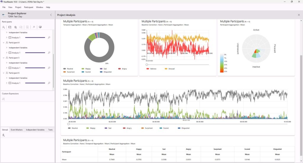 FaceReader valence–arousal graph showing users’ emotional fluctuations during the linking process — calm baseline overall (79.7% neutral affect), with visible frustration spikes at validation and terminology steps.